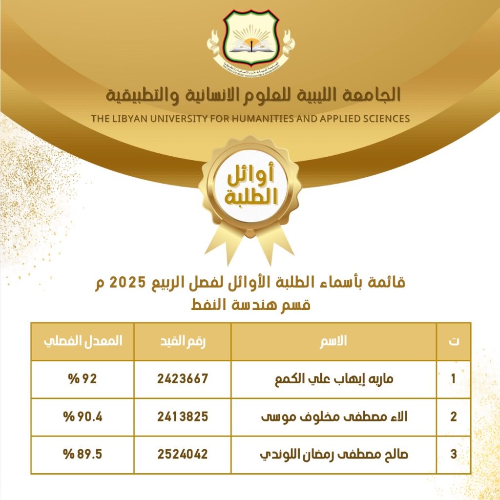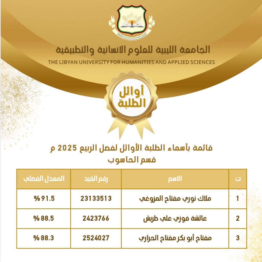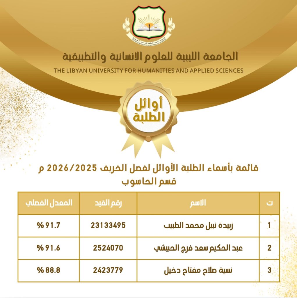 ألف ألف مبروك للطلبة الأوائل في جميع الأقسام العملية للفصل الدراسي ربيع 2025 م والفصل الدراسي خريف 2026/2025 م .. نتمنى لكم مزيداً من التوفيق والتألق والنجاح 🤲🏻💐