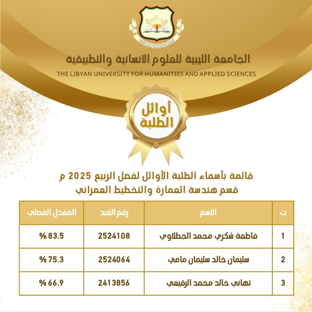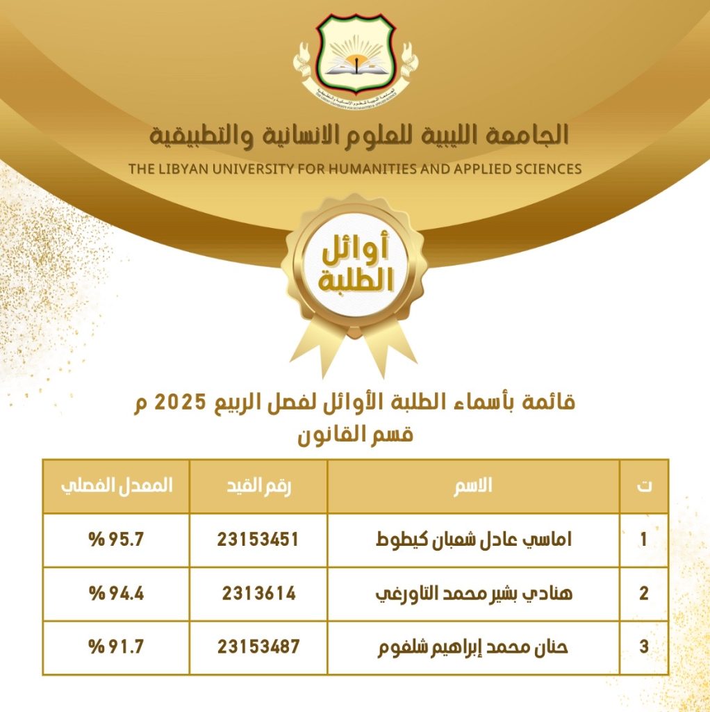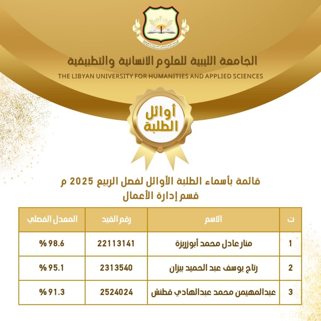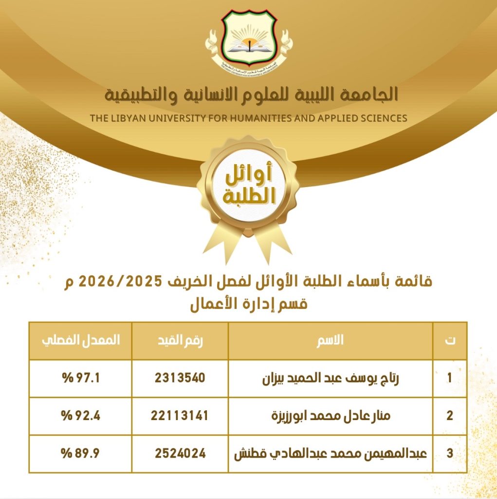 ألف ألف مبروك للطلبة الأوائل في جميع الأقسام العملية للفصل الدراسي ربيع 2025 م والفصل الدراسي خريف 2026/2025 م .. نتمنى لكم مزيداً من التوفيق والتألق والنجاح 🤲🏻💐